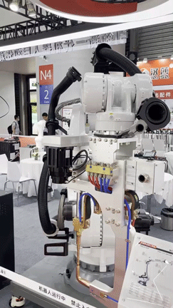 此焊接工作站搭載江龍智能的梟隆焊機,雙電機同步驅動,具有推拉絲、送絲功能,適用于焊接碳鋼、不銹鋼、鋁合金、直流、單脈沖、雙脈沖?,F場為用戶們展示焊接實操,吸引不少國內外客戶駐足觀看。